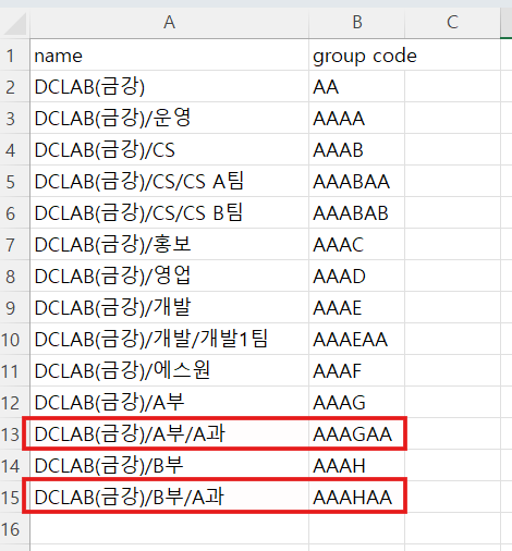 다운로드한 그룹 코드 정보 CSV 파일을 열어, 이동 전인 ‘A부/A과’의 그룹 코드와 이동 후인 ‘B부/A과’의 그룹 코드를 확인합니다.