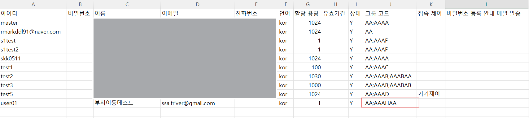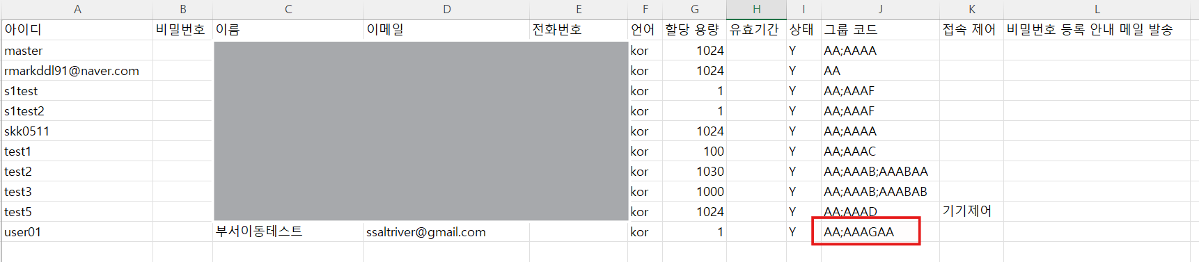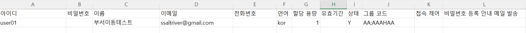 사용자 정보 CSV 파일을 열어, ‘A부A과’의 그룹 코드를 ‘B부A과’의 그룹 코드로 수정합니다.