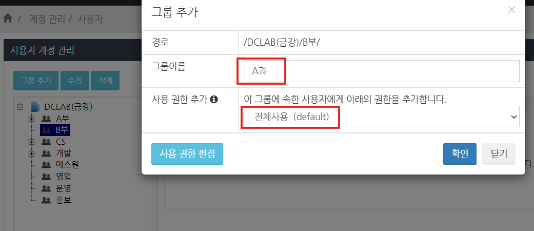 ‘그룹이름'에 ‘A과’를 입력한 뒤, ‘사용 권한 추가’에 ‘보안 정책’ > ‘사용 권한’ 메뉴에서 생성해 둔 이름을 선택하고, 확인 버튼을 클릭합니다.