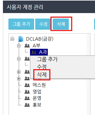 이동 전 기존 그룹인 ‘A부’ 바로 아래에 있는 ‘A과’를 삭제합니다.