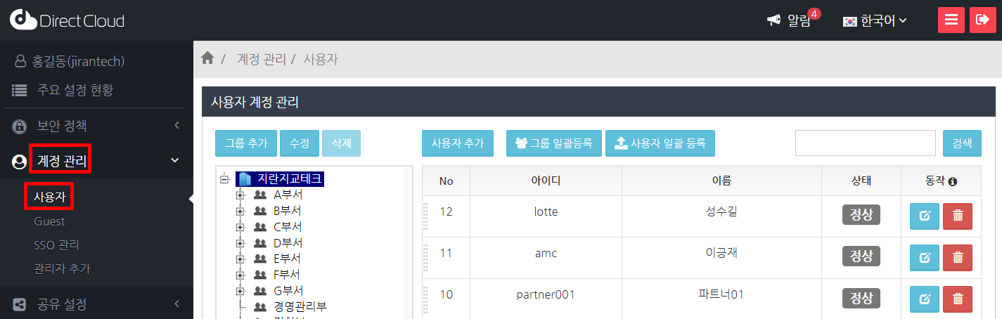DirectCloud 관리 페이지에서는 화면에서 그룹을 선택해 다른 그룹 아래로 바로 이동시키는 것은 불가능합니다. 그룹을 이동하려면 먼저 이동할 대상 그룹을 생성한 후, 사용자 정보를 해당 그룹으로 옮겨야 합니다. 이 매뉴얼에서는 ‘사용자 일괄 처리’ 기능을 활용하여 그룹을 이동하는 방법에 대해 설명합니다.