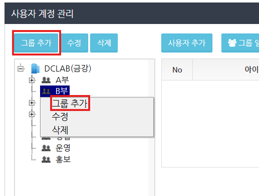 이동할 대상인 ‘B부’ 그룹을 마우스 오른쪽 버튼으로 클릭한 뒤, 표시되는 메뉴에서 ‘그룹 추가’를 클릭합니다. 또는 이동할 대상인 ‘B부’ 그룹을 선택한 후, 상단에 있는 ‘그룹 추가’ 버튼을 클릭합니다.