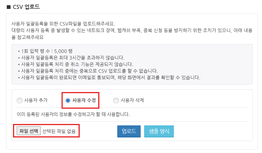 사용자 일괄 처리 등록에서 'CSV 업로드'의 '사용자 수정'을 선택하고 '파일 선택' 버튼을 클릭하여 편집한 사용자 정보의 CSV 파일을 선택합니다.