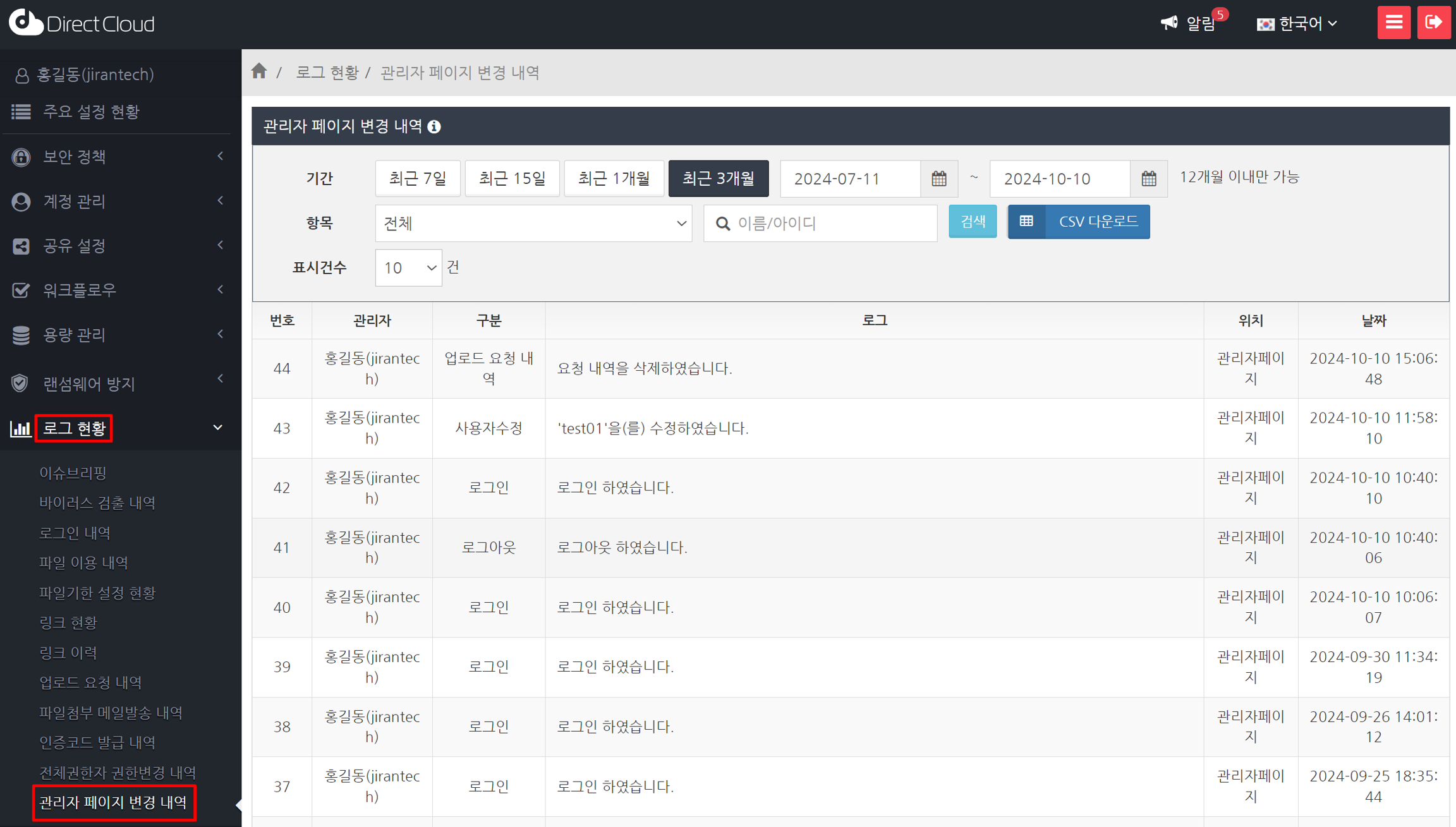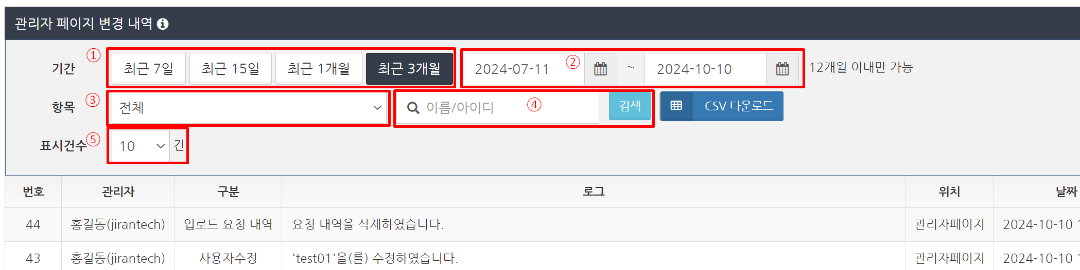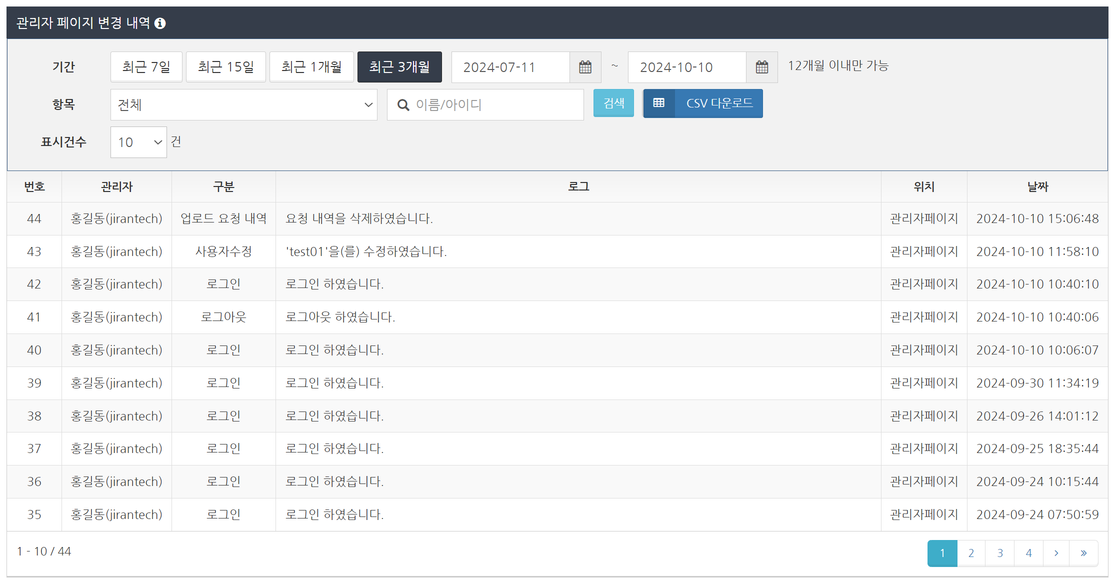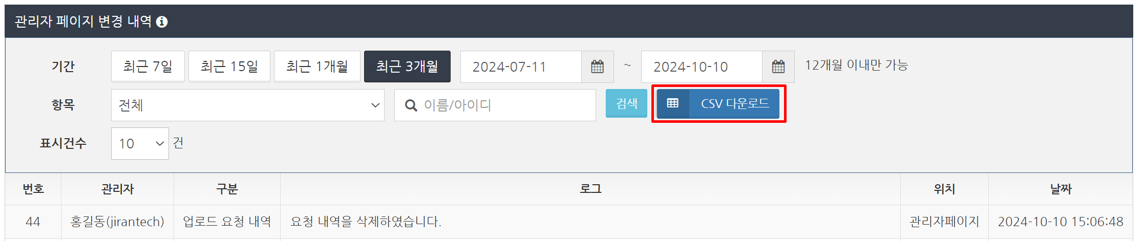 '관리자 페이지 변경 내역'에서 'CSV 다운로드' 버튼을 클릭합니다. CSV 파일이 다운로드됩니다. 관리자의 조작 이력은 대량의 데이터가 될 수 있으므로 미리 필터링하여 표시한 후 다운로드 하는 것이 좋습니다.
