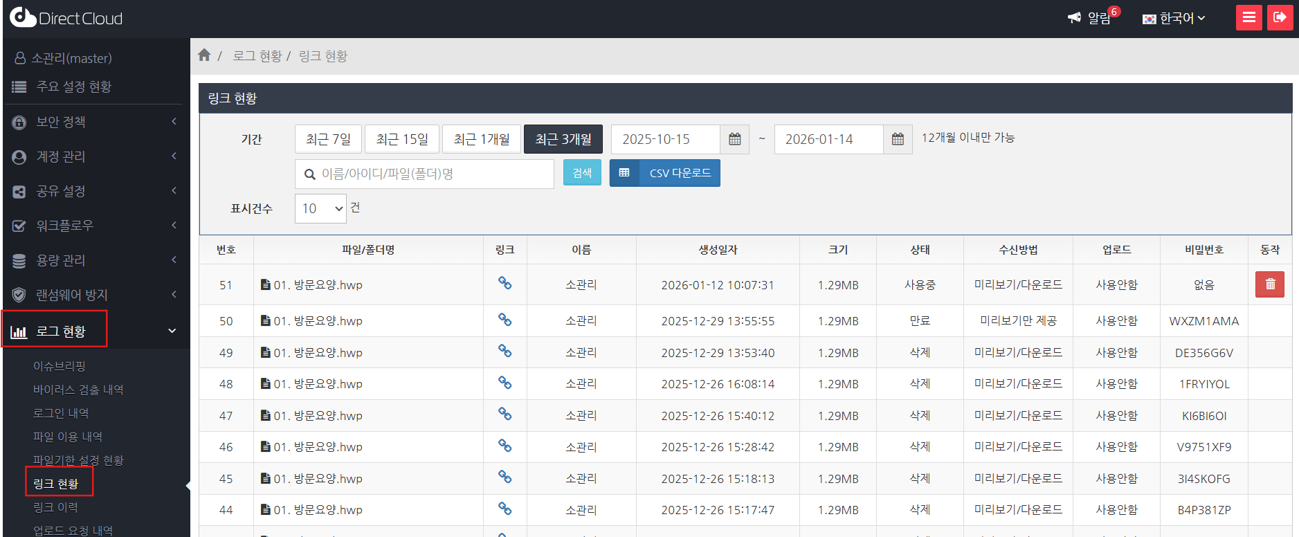 계약 담당 관리자 및 일반 관리자에 대해 사용자가 생성한 링크를 삭제하지 못하도록 설정할 수는 없습니다. 단, 일반 관리자에 대해서는 관리자 기능 제한에서 '로그 현황'의 체크를 해제함으로써 '링크 현황 '메뉴에 접근할 수 없도록 설정할 수 있습니다.