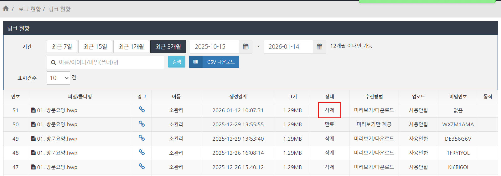 삭제한 링크의 '상태'가 '삭제'로 변경되었는지 확인합니다.