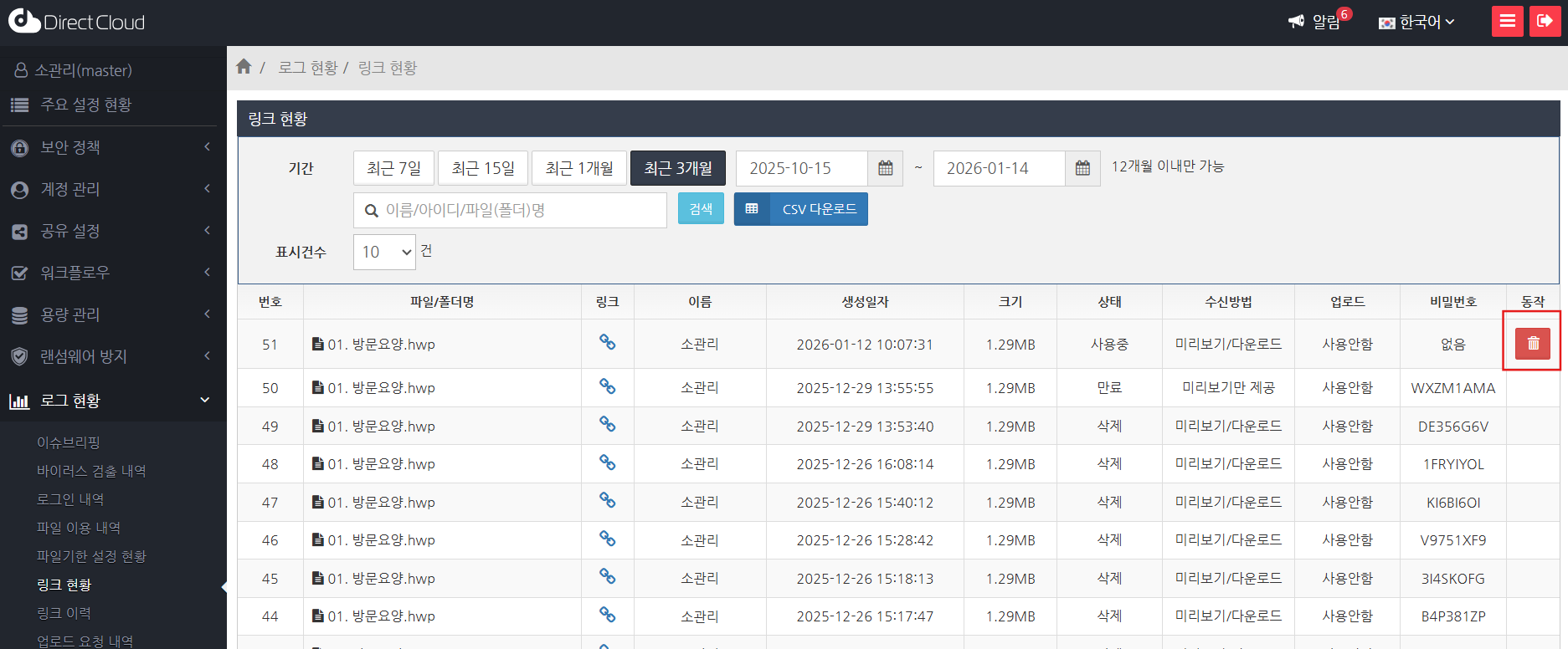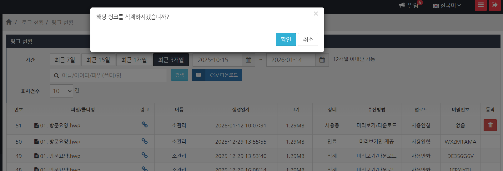 이 매뉴얼에서는 '로그 현황' > '링크 현황' 메뉴에서 사용자가 만든 링크를 삭제하는 방법에 대해 설명합니다.