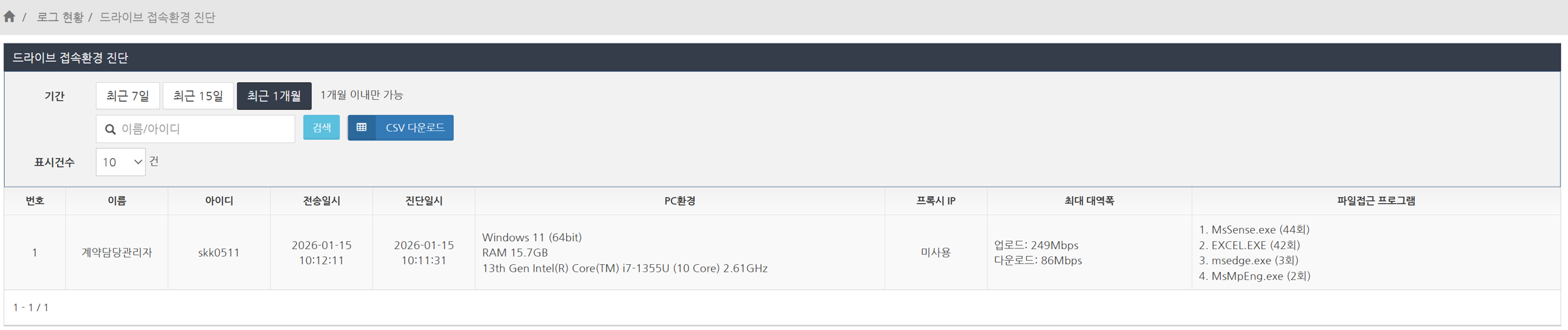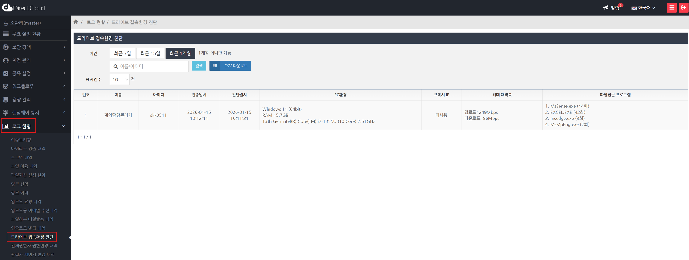 DirectCloud 드라이브 환경 진단 로그를 CSV 파일로 다운로드하기