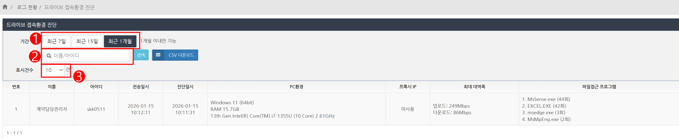 '드라이브 접속환경 진단' 화면에서는 DirectCloud 드라이브 환경 진단 로그를 기간, 사용자, 파일명, 표시건수로 필터링하여 표시할 수 있습니다.