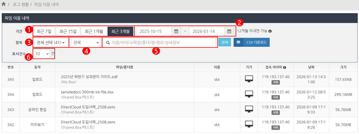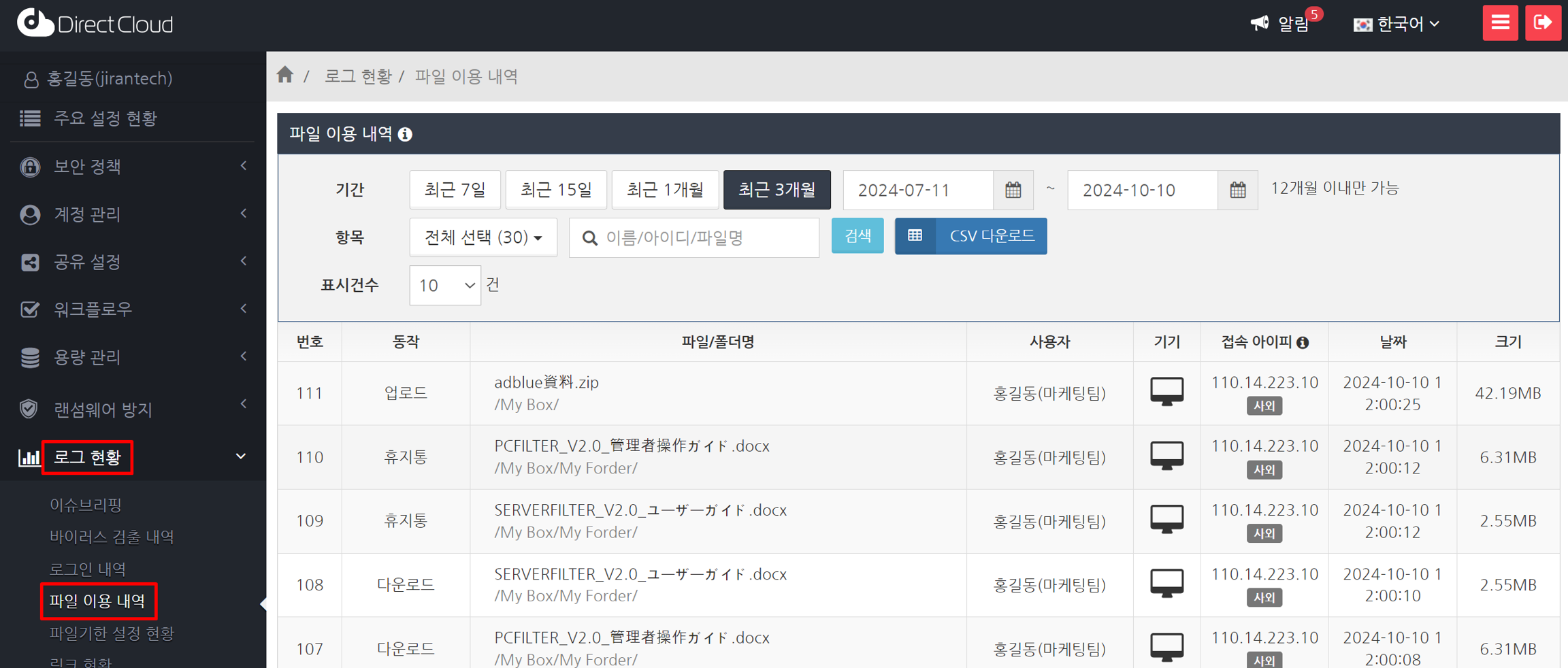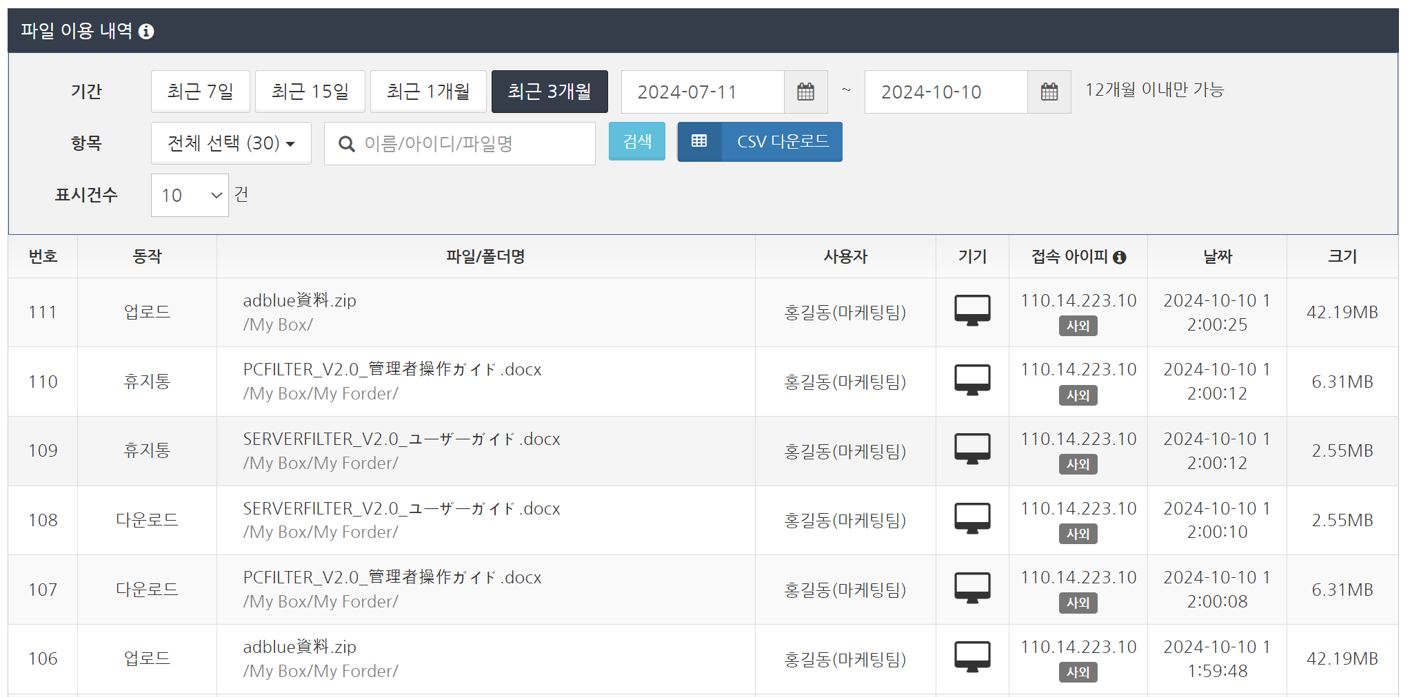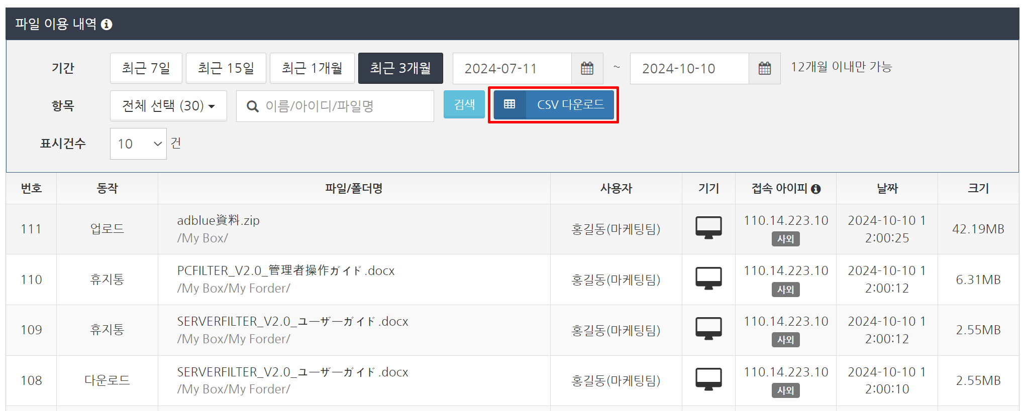 파일 이용 내역에서 'CSV 다운로드' 버튼을 클릭합니다. 파일 이용 내역은 대량의 데이터가 될 가능성이 있으므로, 미리 필터링 후다운로드하는 것을 추천합니다. CSV 파일이 다운로드됩니다.