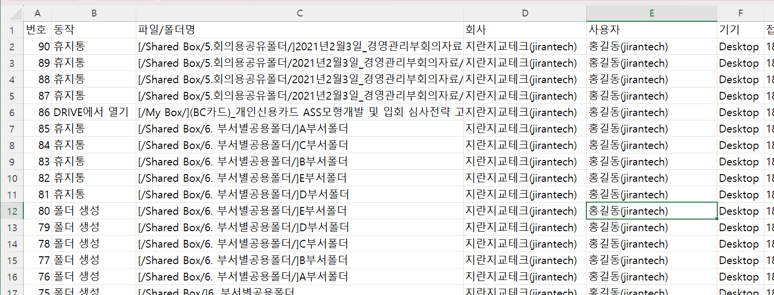 'DirectCloud-SHIELD DLP'를 계약하고 있는 경우, 사용자의 조작 이력에 DLP 폴더에 관한 조작 로그가 기록됩니다.