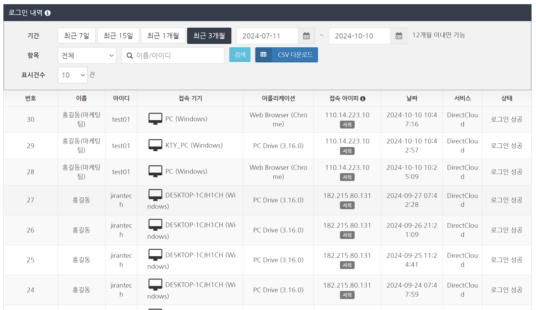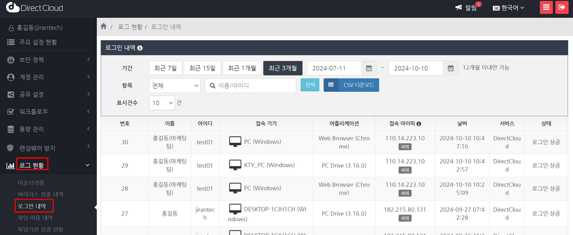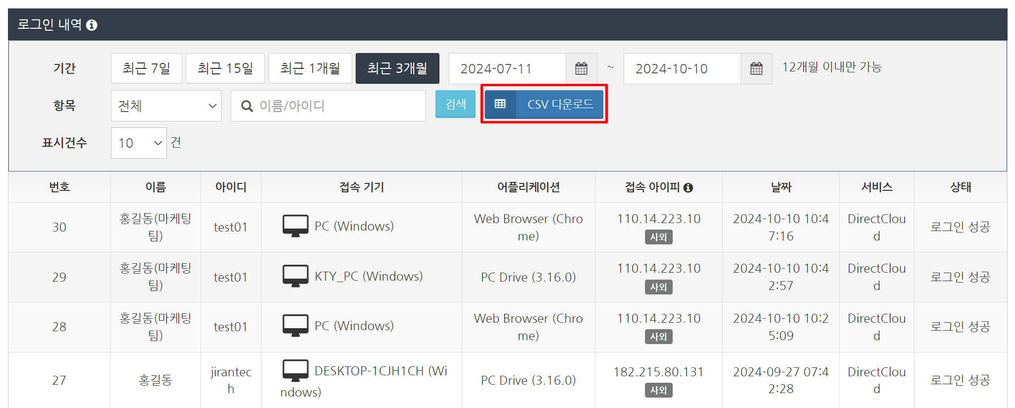 로그인 설정에서 'CSV 다운로드' 버튼을 클릭합니다. 로그인 이력은 대량의 데이터가 될 수 있으므로 미리 필터링하여 표시한 후 다운로드하는 것이 좋습니다. CSV 파일이 다운로드됩니다.