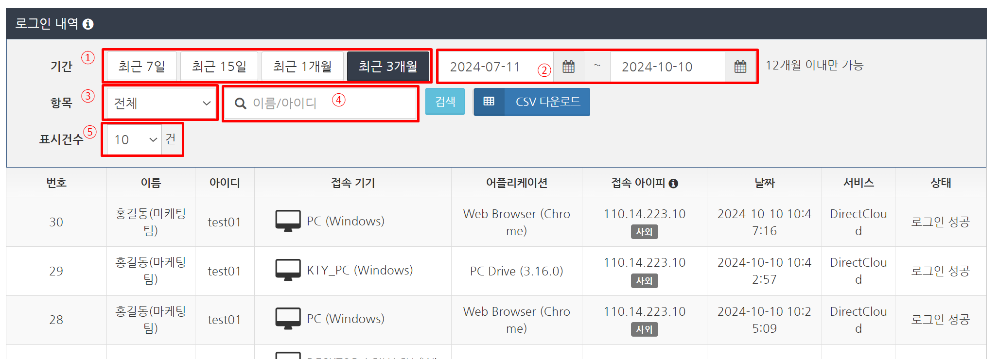 필터링설정을 사용하면 기간, 사용자, 로그인 결과, 건수별로 로그인 내역을 필터링할 수 있습니다.