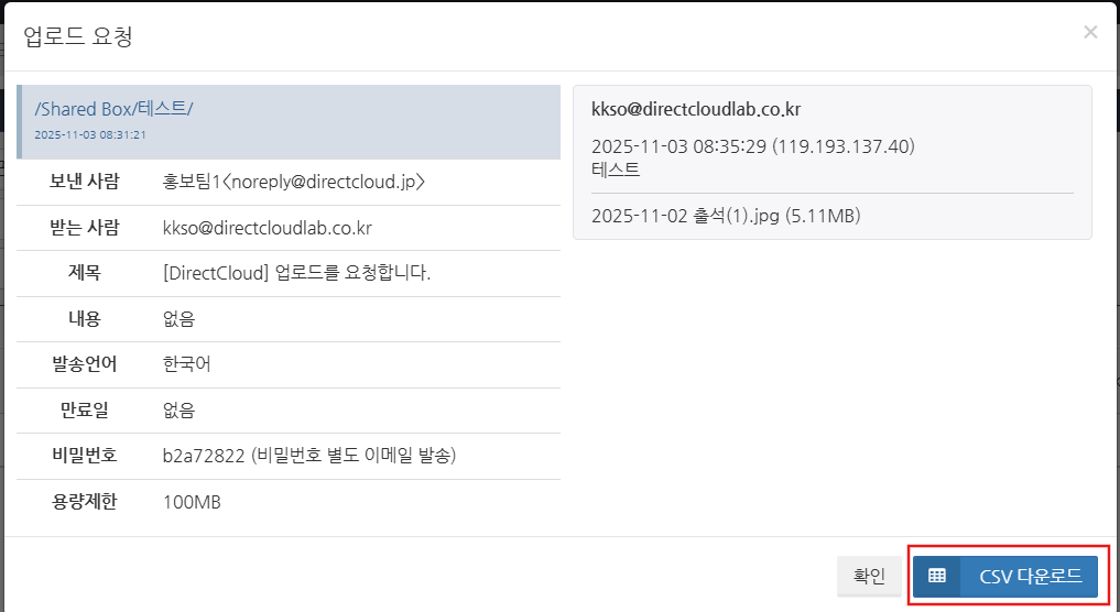 업로드 요청의 설정 정보와 업로드 이력을 CSV 파일로 다운로드하려면, 'CSV 다운로드' 버튼을 클릭합니다. CSV 파일이 다운로드됩니다.