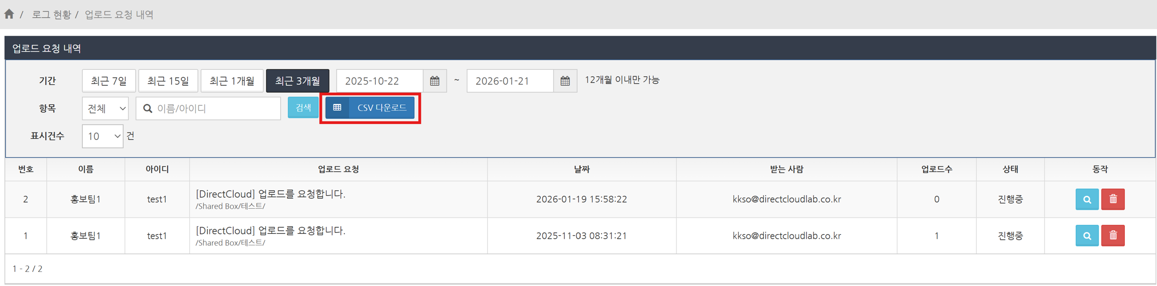 업로드 요청 내역을 CSV 파일로 다운로드