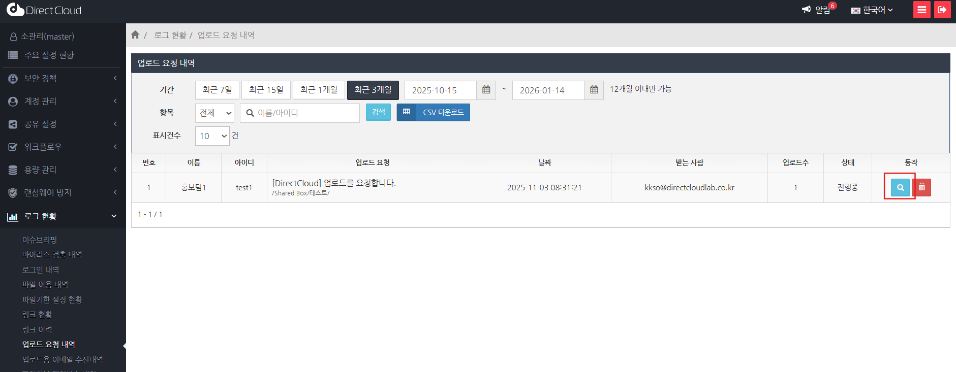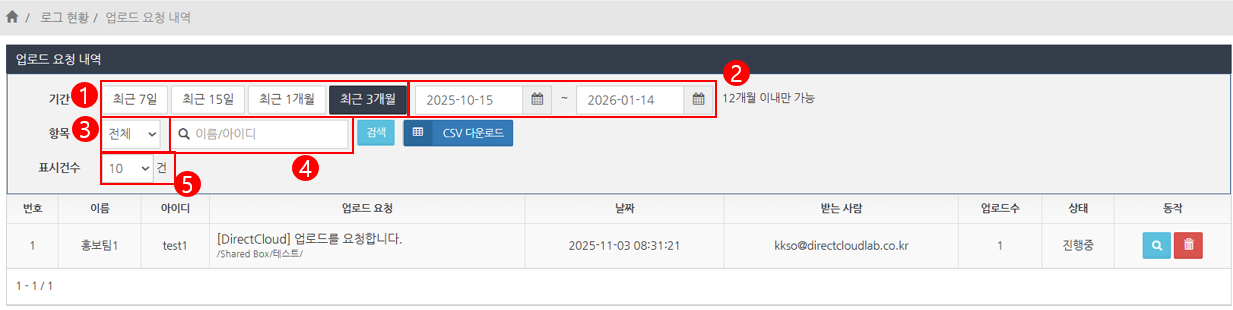 '업로드 요청' 화면에서는 업로드 요청의 이력을 기간, 사용자, 상태, 표시건수로 필터링하여 표시할 수 있습니다.