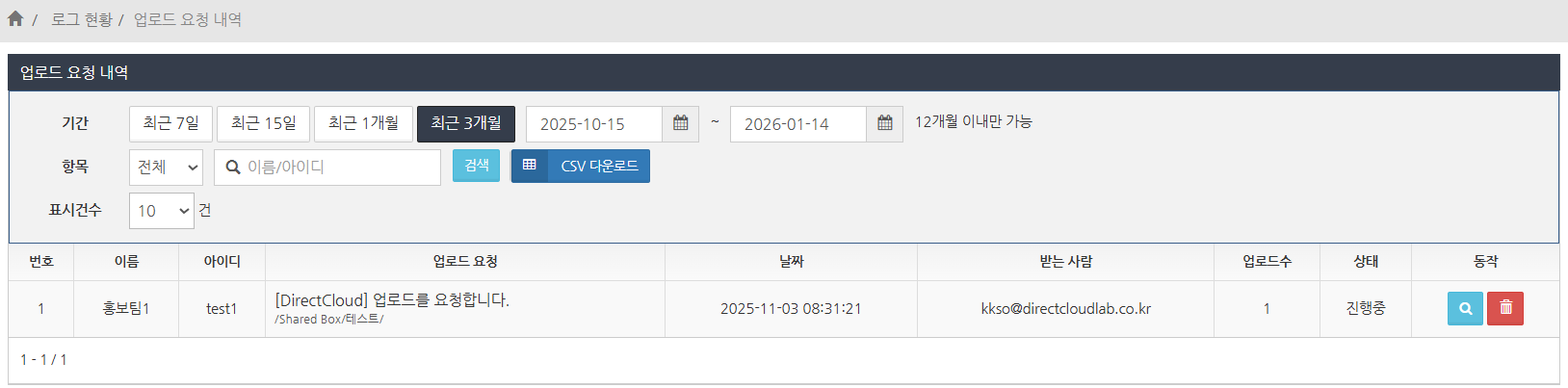 업로드 요청에는 폴더를 업로드할 수 없기 때문에, '업로드 요청' 화면에서 확인할 수 있는 것은 파일 업로드 이력만 해당됩니다.