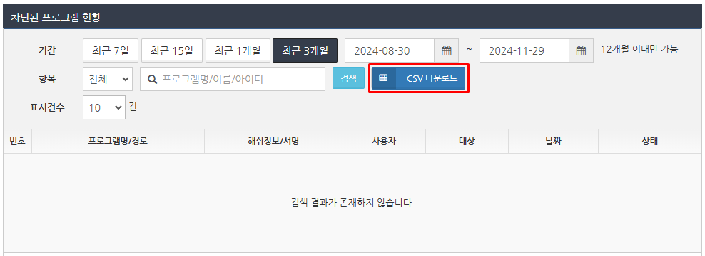 차단 프로그램 목록에서 CSV 다운로드 버튼을 클릭합니다. CSV 파일이 다운로드됩니다. 필요에 따라 차단된 프로그램 목록을 먼저 필터링한 후 다운로드하시는 것을 권장합니다.