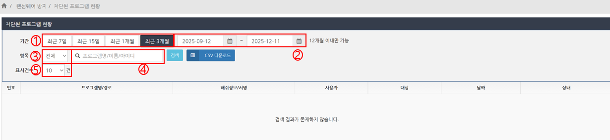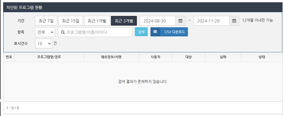 차단된 프로그램 현황에서 차단된 프로그램 목록을 기간, 상태, 프로그램 이름, 사용자, 건수로 필터링 하여표시할 수 있습니다.