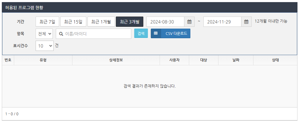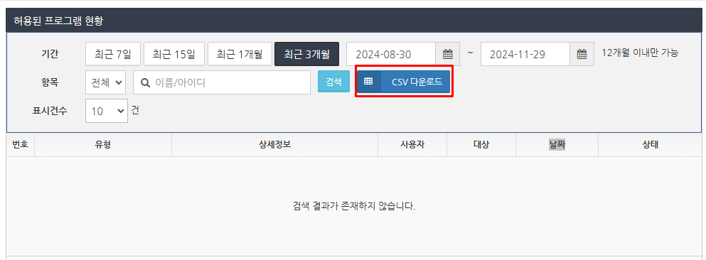 허용된 프로그램 목록에서 CSV 다운로드 버튼을 클릭합니다. CSV 파일이 다운로드됩니다. 필요에 따라 허용된 프로그램 목록을 먼저 필터링한 후 다운로드하시는 것을 권장합니다.