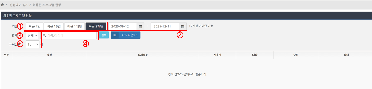 허된 프로그램 목록을 표시할 기간을 직전 7일, 직전 15일, 직전 1개월, 직전 3개월 중에서 선택합니다.