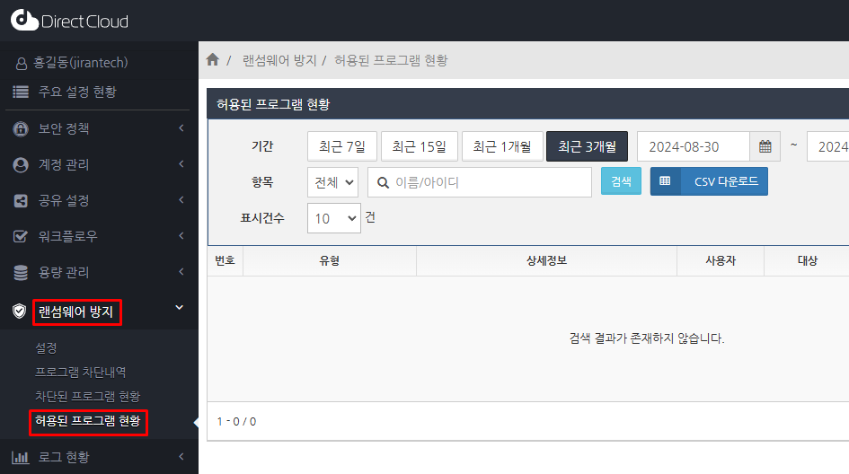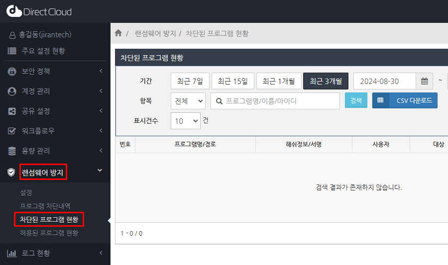 DirectCloud의 기본 기능인 랜섬웨어 방지를 사용하시면, 짧은 시간 안에 여러 차례 파일을 변경한 프로그램을 랜섬웨어로 판단하여 자동으로 차단할 수 있습니다. 이 매뉴얼에서는 관리자 페이지에서 차단된 프로그램과 허가된 프로그램을 각각 목록으로 확인하는 방법을 설명합니다.