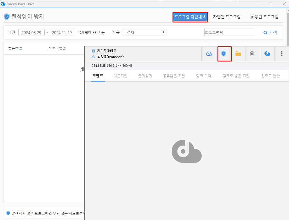 랜섬웨어 방지 기능으로 차단되는 대상은 DirectCloud 드라이브에 저장된 파일을 변경한 프로그램만 해당됩니다. 파일을 열기만 한 경우에는 변경으로 판단되지 않습니다.