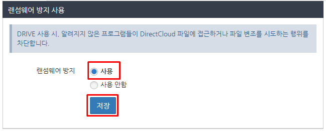 '랜섬웨어 방지' 사용 설정에서 '사용'을 선택하고 저장 버튼을 클릭합니다.