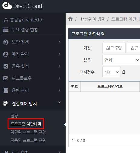 관리자 권한이 부여된 사용자는 관리자 페이지에서 '랜섬웨어 방지' 항목에 접근 가능합니다.