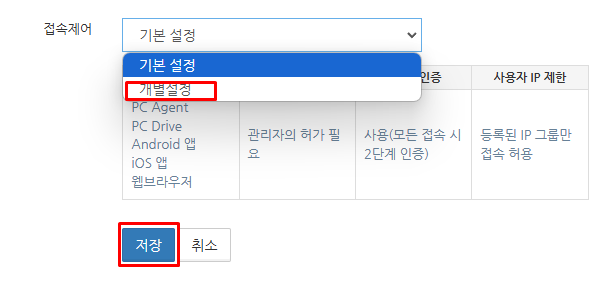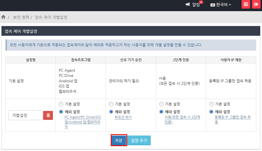 '접속 제어' 설정을 표시하고 '접속제어개별 설정'에서 만든 설정 이름을 선택하고 "저장" 버튼을 클릭합니다.