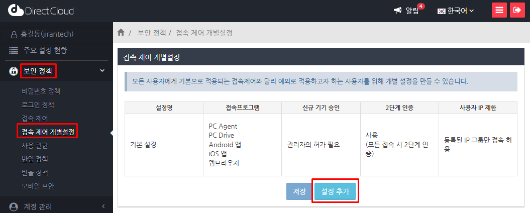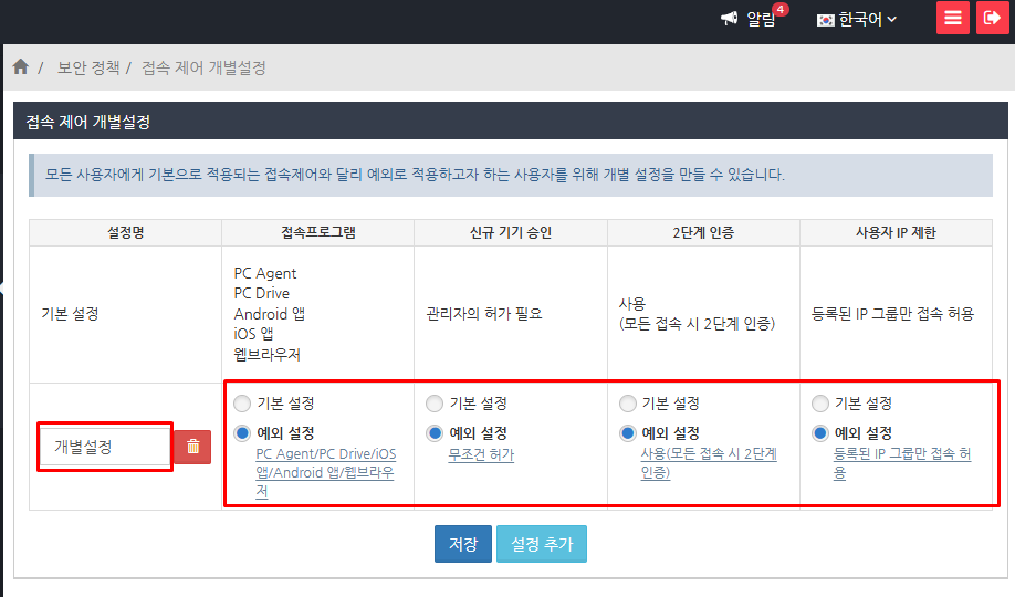 '보안 정책' > '접속 제어 개별설정' 메뉴를 선택하고 설정 추가 버튼을 클릭합니다.