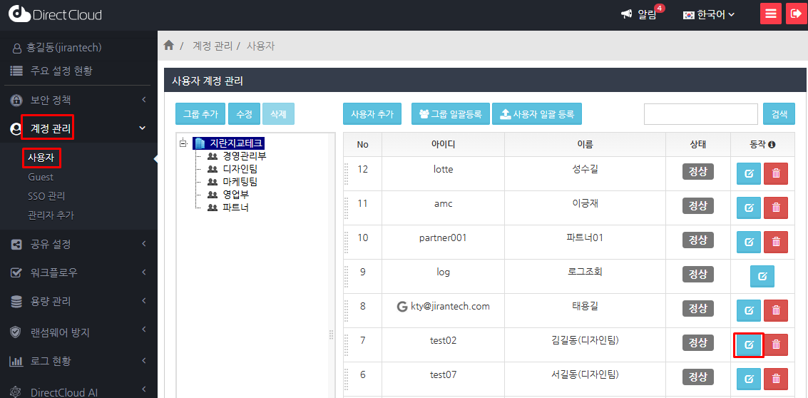 '계정 관리' > '사용자'를 선택하고 접속 제어의 개별설정을 적용하려는 사용자의 '동작' 필드에 표시된 편집 버튼을 클릭합니다.