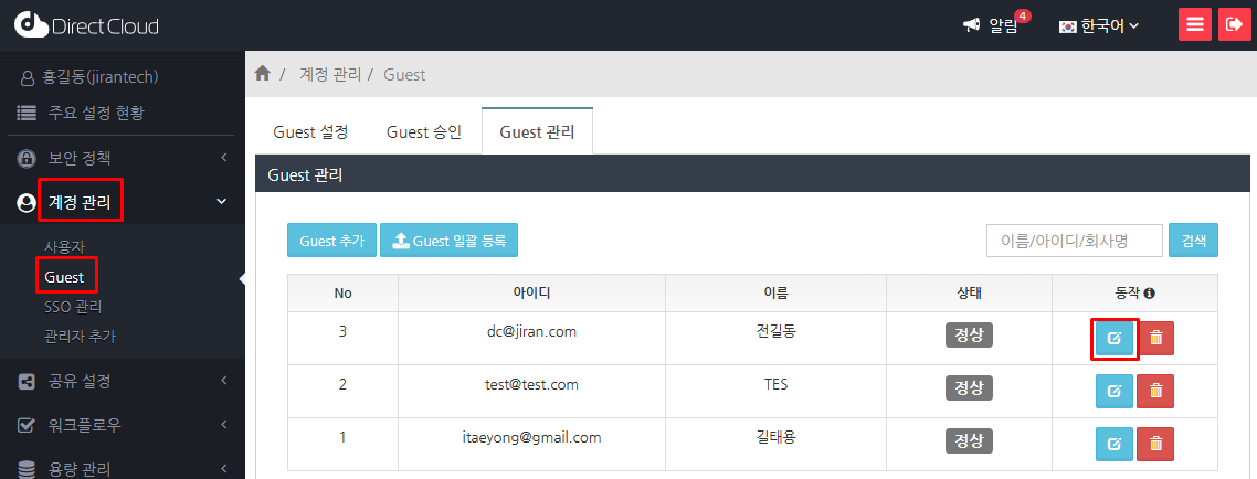 '계정 관리' > 'Guest' 메뉴에서 'Guest 관리' 탭을 선택하고 접근 제어의 개별 설정을 적용하려는 Guest의 동작 열에 표시되는 편집 버튼을 클릭합니다.