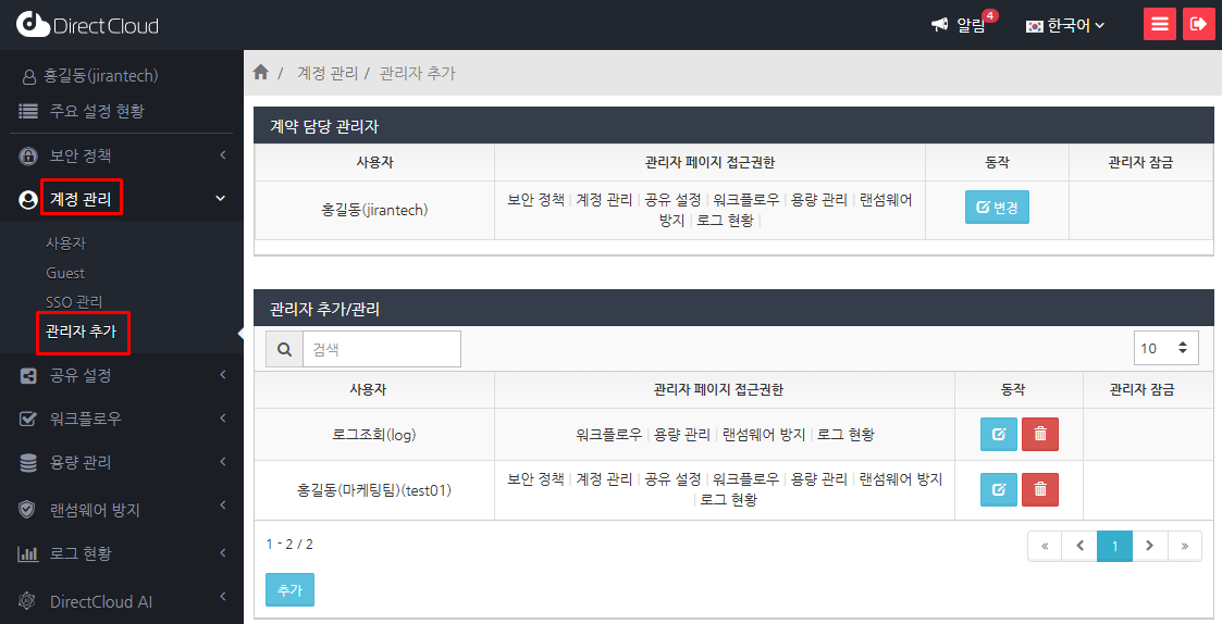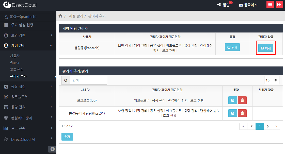 관리 페이지에 로그인할 때 계정이 잠금된 경우: 계약 담당 관리자 또는 일반 관리자가 관리 페이지에 로그인하는 과정에서 계정이 잠금된 경우에는 '계정관리' > '관리자 추가'메뉴에서 계정 잠금을 해제합니다.