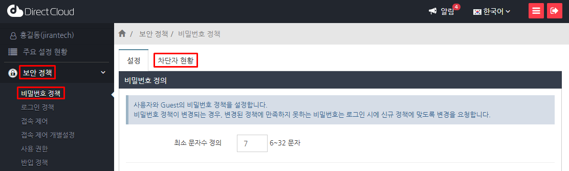 '보안 정책' > '비밀번호 정책' 메뉴를 선택하고 '차단자 현황' 탭을 클릭합니다.