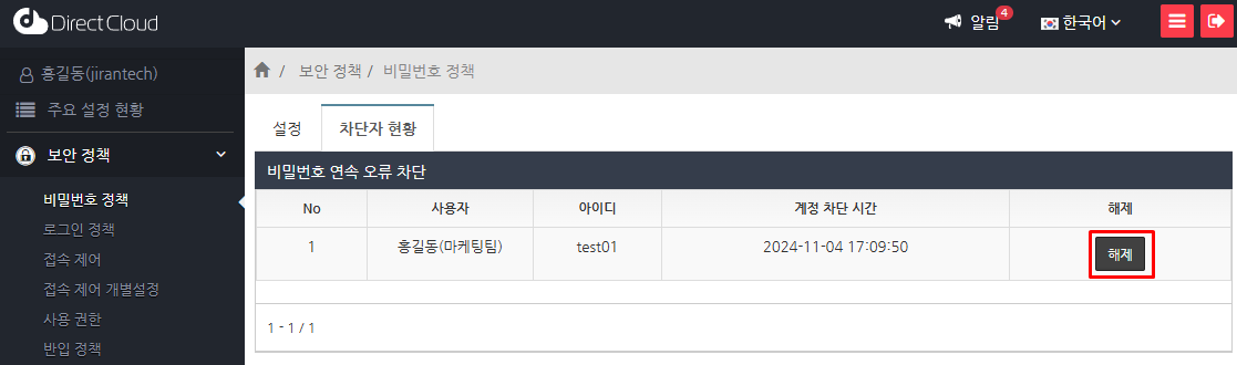또한 관리자 페이지의 '비밀번호 정책'->'정책 위반 설정'에서 '계정 차단 자동 복구' 기능이 허가안함 으로 되어있어야 합니다.