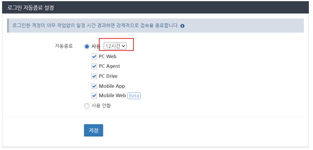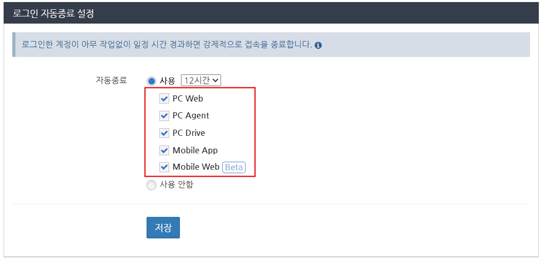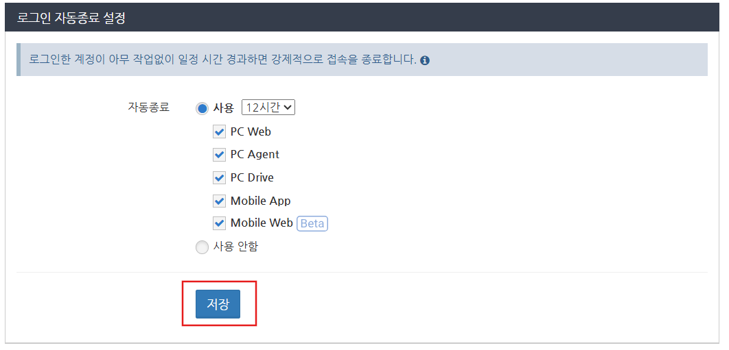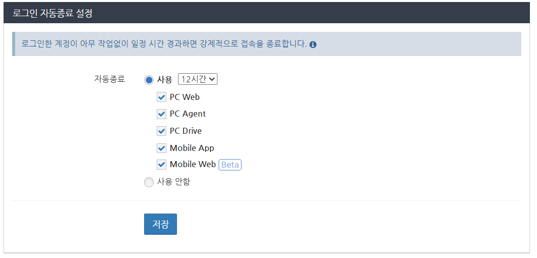 자동 로그아웃은 기본적으로 사용함으로 설정되어 있으며, PC 버전 Web 브라우저, PC Agent, DirectCloud 드라이브, 모바일 애플리케이션을 사용하는 경우에는 30분 동안 조작이 없으면 자동으로 로그아웃되도록 설정되어 있습니다.
