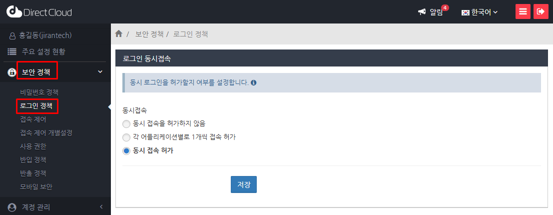 '보안 정책' > '로그인 정책' 메뉴를 선택합니다.