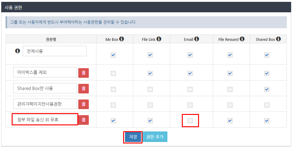 표준 상태에서는 그룹·사용자에게 모든 기능(My Box, 링크, 첨부파일 전송, 업로드 요청, Shared Box)이 적용됩니다.