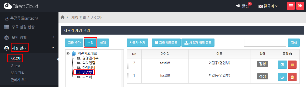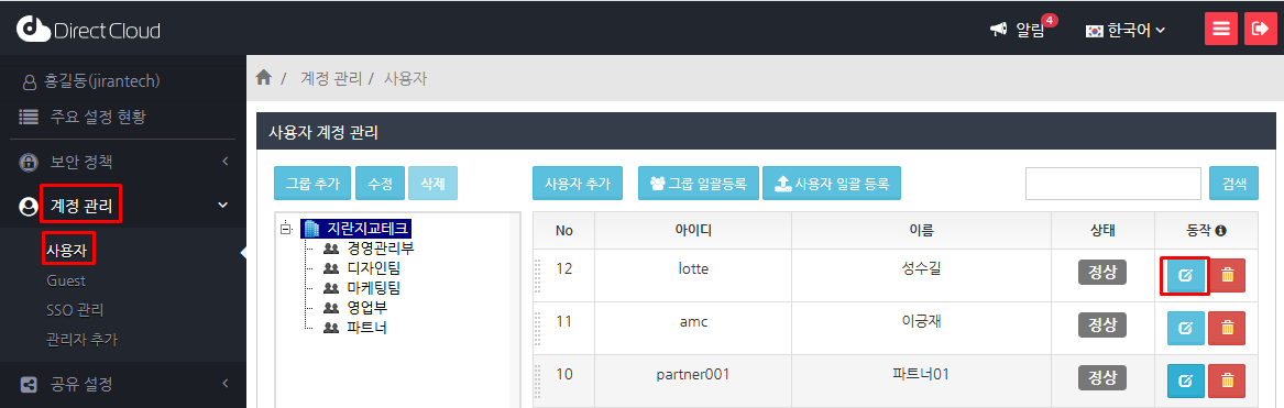 '계정 관리' > '사용자' 메뉴를 선택하고 첨부파일 전송 기능을 제외할 사용자를 선택하고 편집 버튼을 클릭합니다.