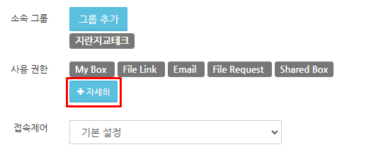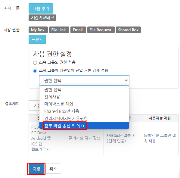 해당 사용자의 사용 권한을 '소속 그룹에 상관없이 단일 권한 강제 적용'을 선택하고 사용 권한에서 만든권한을 선택한 다음 저장 버튼을 클릭합니다.
