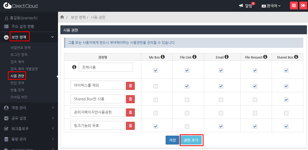 '보안 정책' > '사용 권한' 메뉴를 선택하고 권한 추가 버튼을 클릭합니다.
