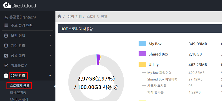 '용량 관리' > '스토리지 현황' 메뉴를 클릭합니다.