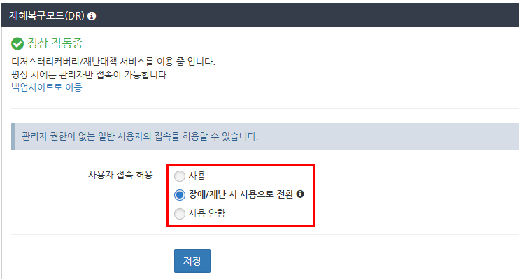 화면을 아래로 스크롤하고 '재해복구모드(DR)' 설정의 '사용자 접속 허용'에서 다음을 설정하고 저장 버튼을 클릭합니다.