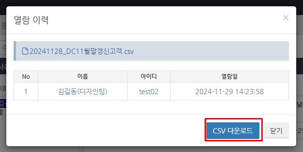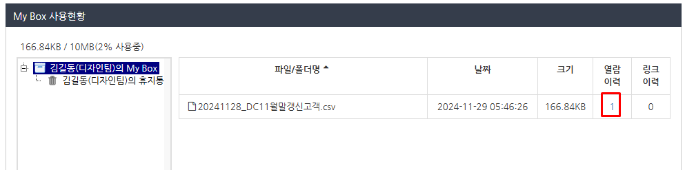 My Box 사용 설정에서 확인하려는 파일의 '열람 이력' 열의 숫자를 클릭합니다. 열람 이력 화면이 표시됩니다.
