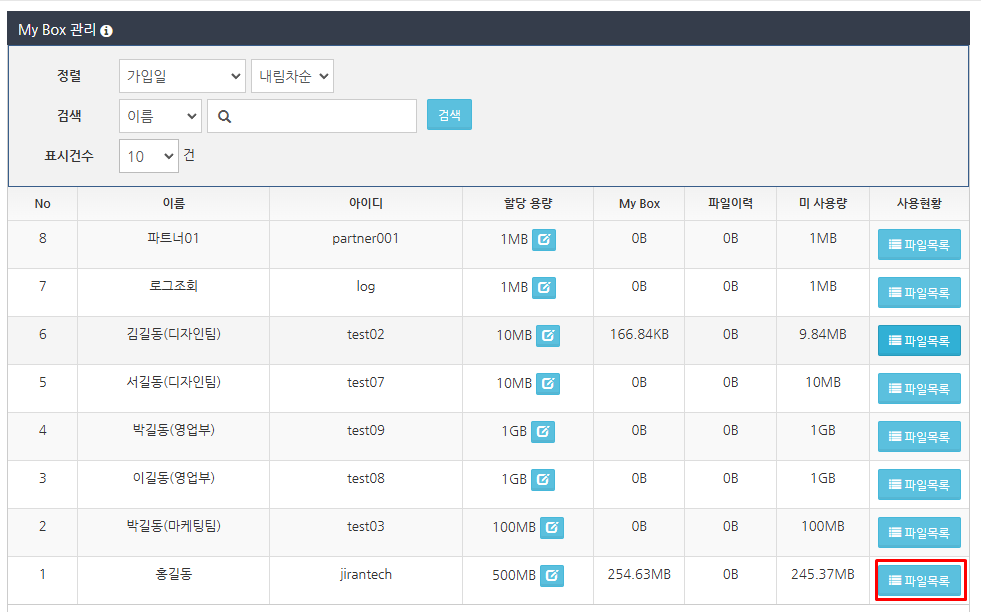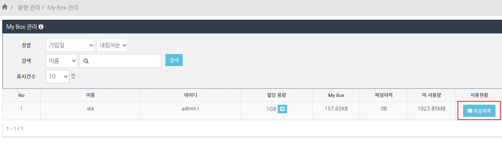 My Box 관리에서 확인하려는 사용자의 '사용 현황' 열에 표시된 '파일목록' 버튼을 클릭합니다.