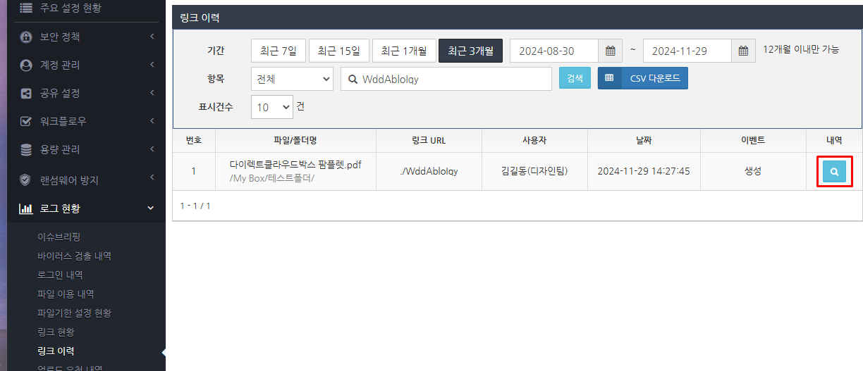 링크의 내역을 확인하려면 링크 이력 화면에서 내역 열의 아이콘을 클릭하십시오. '로그 현황' > '링크 이력' 메뉴가 표시됩니다.