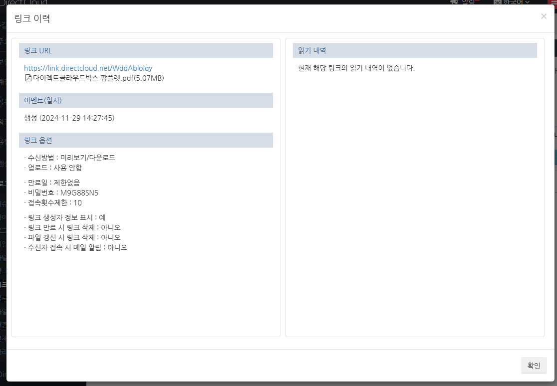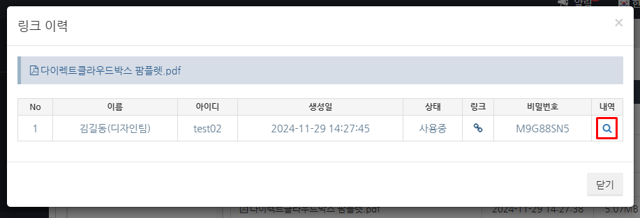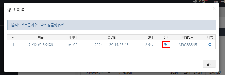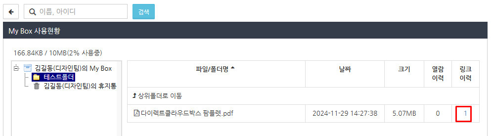 My Box 사용현황에서 '링크 이력' 열의 숫자를 클릭합니다. 링크 이력 화면이 표시됩니다.