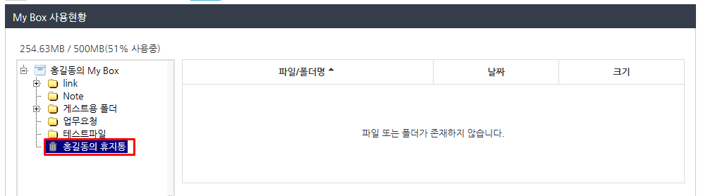'My Box 사용현황' 에서 '○○의 휴지통'을 선택하여 사용자의 휴지통에 저장된 폴더, 파일을 확인합니다.