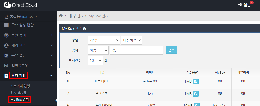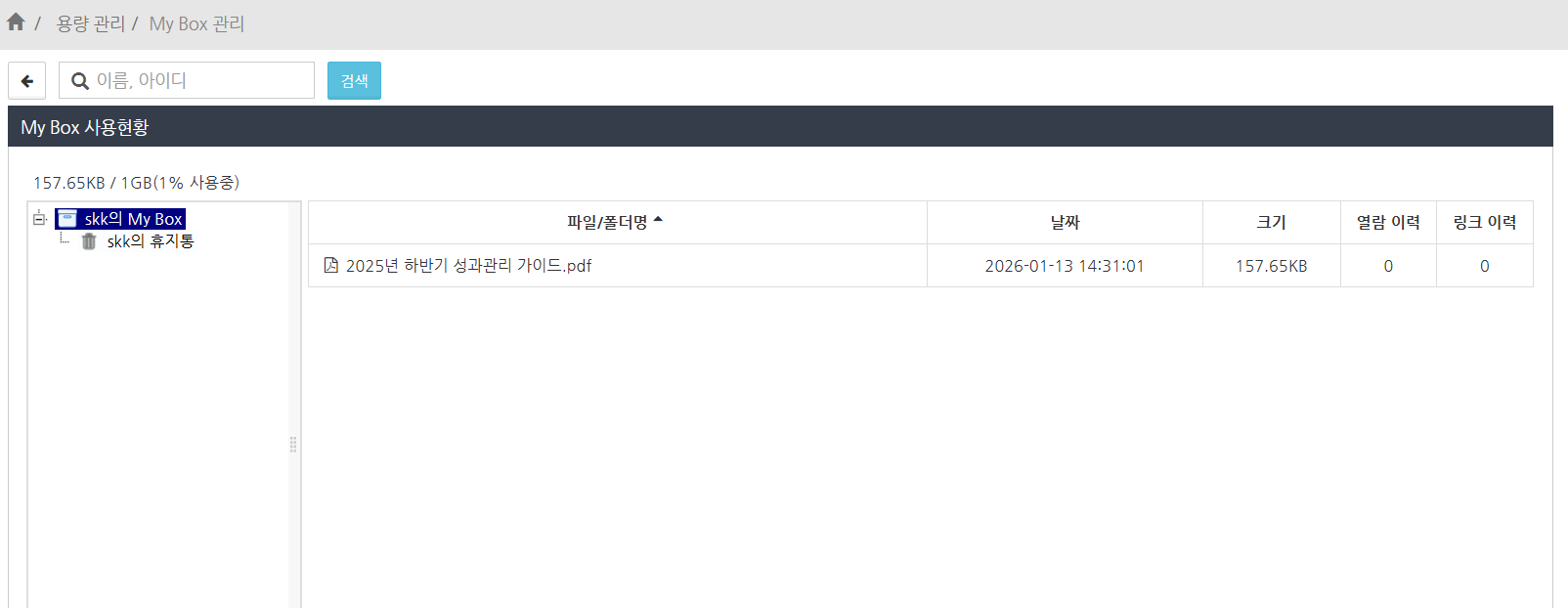 '용량 관리' > 'My Box 관리' 메뉴를 클릭합니다.